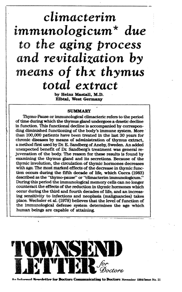 The expression thymus therapy stands for standard injection of specific thymus hormones, the so-called thymus peptides. Thymus therapy is an important, if not the most important non-specific base immunotherapy. This therapy causes activation and balancing of cell defense. Thymus therapy goes back to Dr. Elis Sandberg, Sweden, who already achieved notable success in the treatment of chronic deseases and cancer with his use of the macromolecular THX (thymus total extract) in 1938. By the 80's, Sandberg had successfully treated over 50,000 patients. In many patients he additionally noticed an euphoric and anti-aging effect.